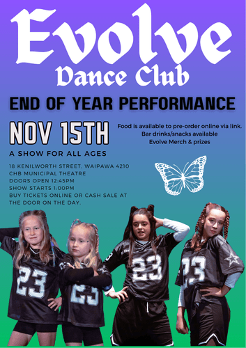 Come and celebrate the incredible talent of our local dancers at the Evolve Dance End of Year Performance Show! Featuring performers aged 5–17, this high-energy showcase will bring Hip Hop and other dance styles to the stage, highlighting the creativity, confidence, and hard work our young people have put in throughout the year.