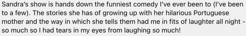 Laugh or cringe as you are introduced to Sandra's life growing up in London with a Portuguese mother and a family with their own blend of crazy. 'You're Not Pretty... But I love You' is a show about the hilarious situations that come with surviving two cultures, navigating relationships and embracing your true self, even a Mediterranean mother's with no filter. The title of the show is a true quote from Sandra’s mum. If you have a messy family, and you think 'My Big Fat Greek Wedding' is a documentary - you are her people, and this is your show.