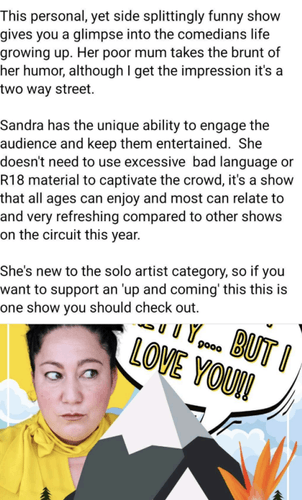 She is a 2023 RAW National Comedy Semi-Finalist and is currently performing across Tāmaki- Makaurau, Kirikiriroa, the Waikato and nationwide. Sandra has a sold out breakthrough show ‘Yeah Nah Pavlova’ under her belt which debuted at the NZ International Comedy Festival 2024 and showcased at The Melbourne Comedy Fest 2025. She is currently touring her first self written and produced stand up show “You’re Not Pretty...But I Love You”, following sold out launches in Auckland and the Waikato.